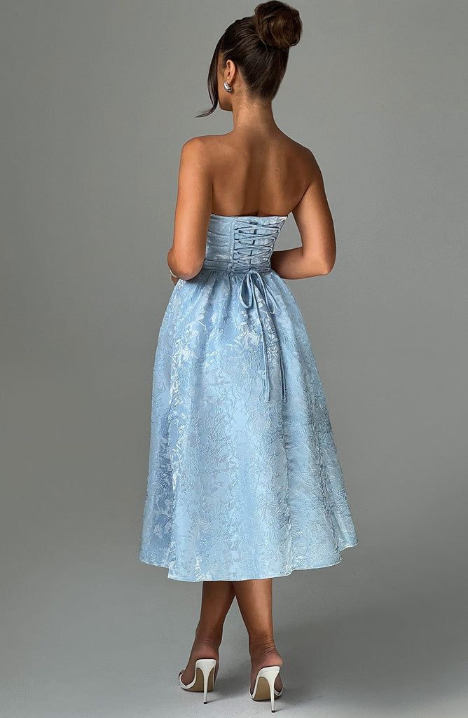 A dress to wear all seasons, Saoirse is cut from our prettiest floral jacquard fabric in a midi length with super full skirt lined with tulle for extra volume. This strapless style has boning in the bodice for a cinched waist, with pleating and gathered detailing. The look is complete with lace up back. Wear with a pointed heel and chic hair up.