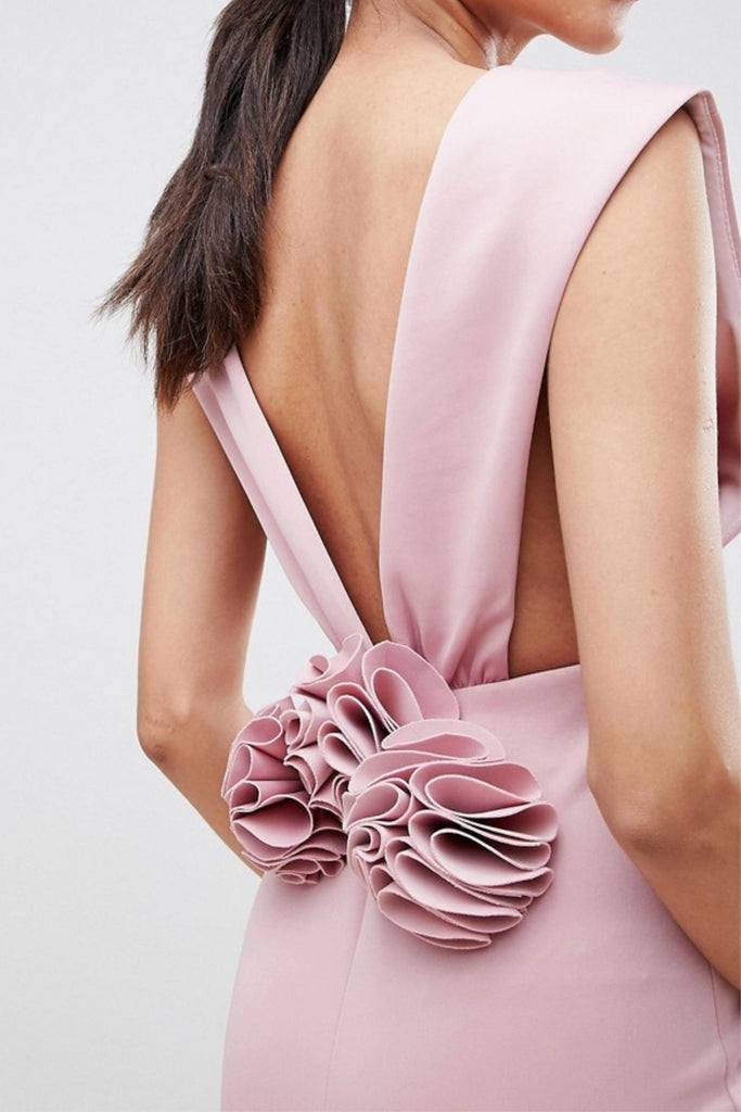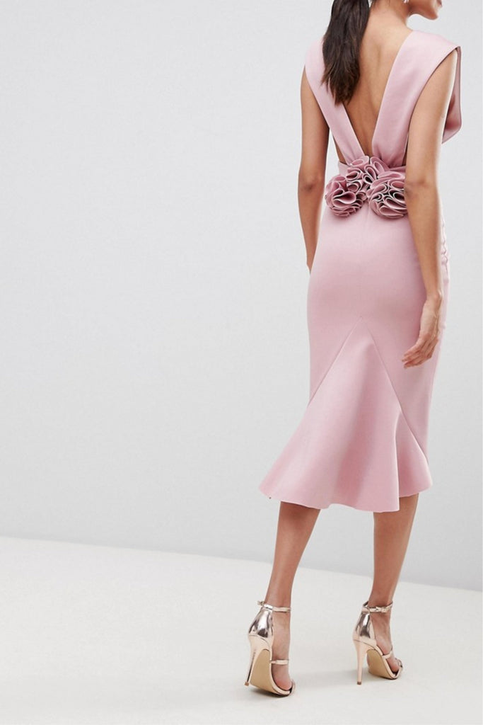 Deep Plunge Corsage Back Pephem Midi Bodycon Dress