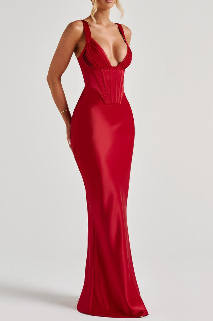 Indulge in luxury with our Shae Maxi Dress in red. This elegant and glamorous dress features a fan-shaped adjustable shoulder straps and a lace-up back for a perfect fit. Crafted from our luxurious bias cut satin which skims the body, while the corset overlay and boning provide a flattering silhouette. Complete with a concealed zipper for a seamless finish.